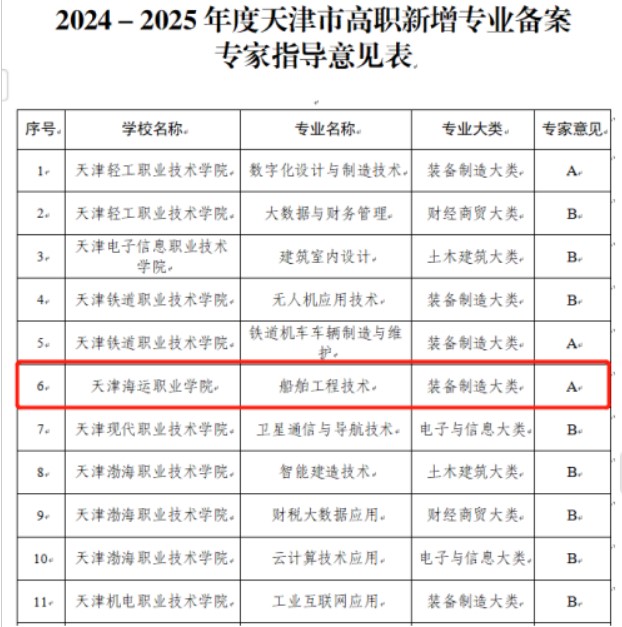 近年来,天津市海洋装备领域发展迅速,船舶工业、海工平台与特种工程船等海洋装备高端化、绿色化、智能化程度走在全国前列。天津海运职业学院积极对接产业需求,增设船舶工程技术专业,服务我市海洋装备从“天津制造”向“天津智造”转变。经学院调研申报,市教委组织专家指导、综合评议,船舶工程技术专业在全市26个新增专业中,成为5个A档专业评价之一,顺利通过我市2025年度高职教育新增专业备案。